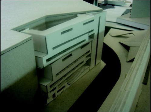 The building’s design started by extruding a volume dividing the public from the private areas. The first mentioned is a horzontal volum which contrast with the vertical volume (circulation) at the side of it. The restaurant which is on the lower area is planned so there can be a connection with the exterio and the garden fomred by the houses’ garage